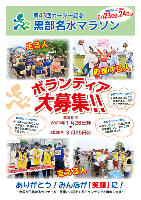 5月23日(土)、24日(日)に開催する「第43回カーター記念黒部名水マラソン」のボランティアを大募集します!